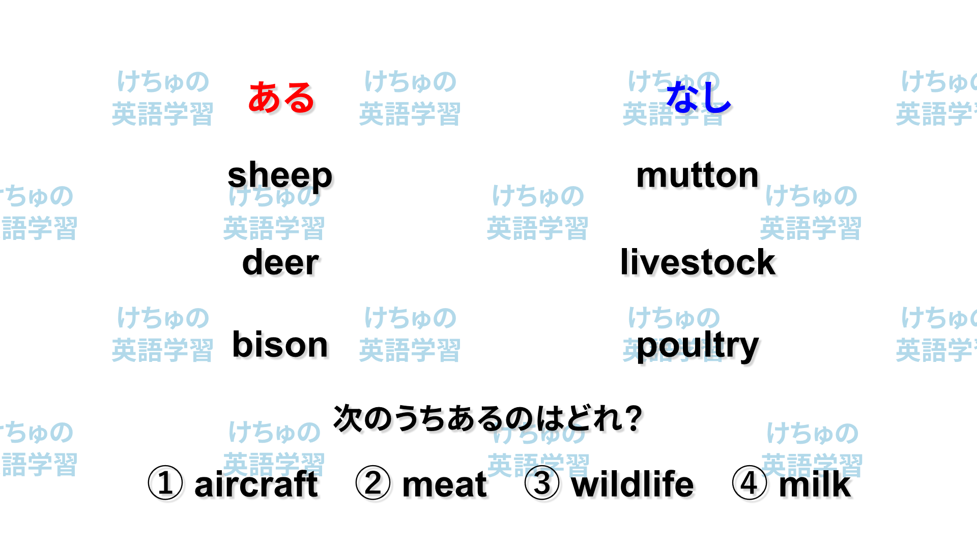 となります。もう分かったと思うのですが、ある方の単語に共通するルールは「単数形でも複数形でも形が変わらない名詞である」というもので、このルールが該当するのは① aircraft だけですね。単複同型は数えられるけど複数形でも形が変化しない名詞であり、「sheep」は不可算名詞であるという説明も時々耳にしますが、単複同型の可算名詞です。